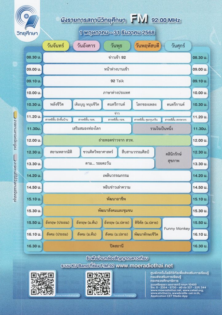 ข่าวประชาสัมพันธ์ ประชาสัมพันธ์รายการวิทยุเพื่อการศึกษา และผังรายการสถานีวิทยุศึกษา FM 92.00 MHz October 2, 2025 Supaporn Sanok